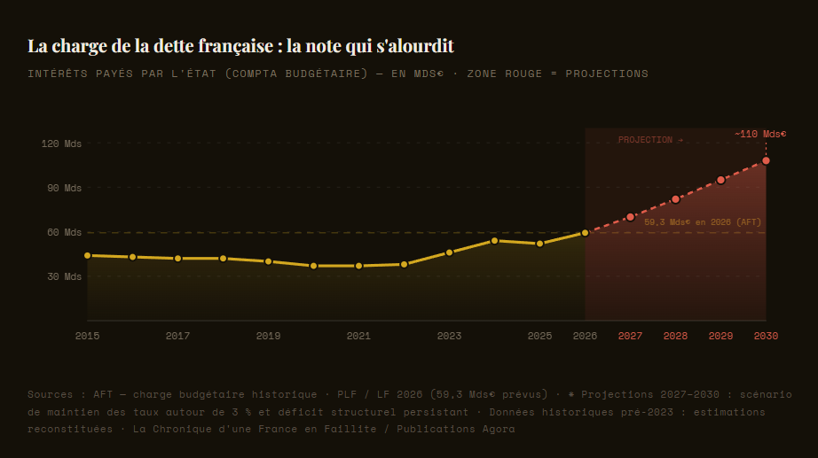 Pendant des années, la France empruntait à des taux proches de zéro. Les obligations qui arrivent à maturité en 2026 portaient en moyenne un coupon de 1,2%. Pour les remplacer, l’Agence France Trésor a emprunté en 2025 à un taux moyen de 3,16%. Ce différentiel, multiplié par les centaines de milliards en jeu, se traduit par une addition supplémentaire de plusieurs milliards d’euros chaque année — et pour des décennies. La charge budgétaire de la dette, qui était de 52 Mds€ en 2025, est déjà prévue à 59,3 Mds€ en 2026.