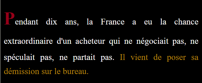 Pendant dix ans, la France a eu la chance extraordinaire d’un acheteur qui ne négociait pas, ne spéculait pas, ne partait pas. Il vient de poser sa démission sur le bureau.