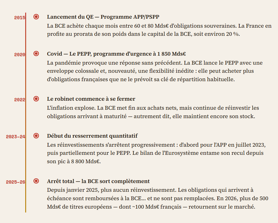 Pendant dix ans, la Banque centrale européenne a acheté des centaines de milliards d’euros de nos obligations d’État. Elle ne le fera plus. La France va devoir convaincre d’autres acheteurs — à des taux bien moins cléments.