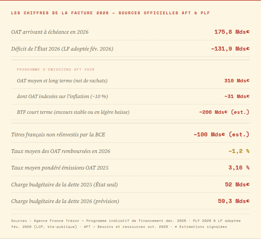 La France doit financer deux choses chaque année : son déficit courant et sa dette ancienne qui arrive à maturité. En 2026, ces deux postes représentent un besoin considérable, que l’Agence France Trésor doit couvrir seule — sans le filet de la BCE.